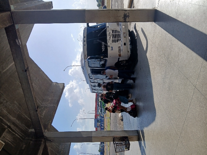 People line up to board a white bus. The group is on a paved surface, possibly a parking area or terminal, near a concrete structure. The bus's front faces the viewer. The sky is visible, filled with clouds, suggesting an outdoor setting. Several streetlights are placed behind the bus. The entire scene appears to be captured from an elevated position.