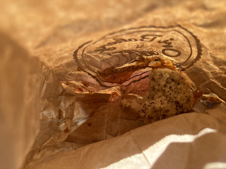 - "A partially eaten muffin sits inside a crumpled brown paper bag" by FM-bmo3E3, licensed under CC BY 4.0