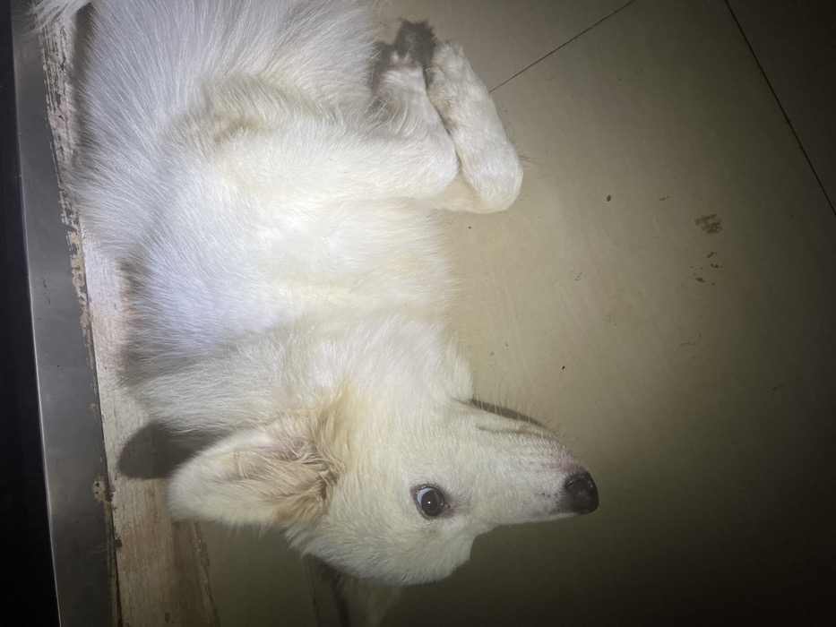 - "The scene depicts a white-furred dog, likely a Spitz-type breed, resting on a light-colored tiled floor within an indoor environment in Ikot Ekpene, Nigeria" by FM-1vJDR2, licensed under CC BY 4.0