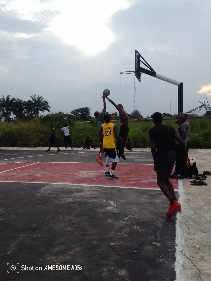 An outdoor basketball game is in progress at a court in Egbagu, Nigeria