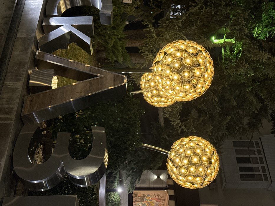 The image features a vertically oriented metal sign displaying the word "KAV." Two illuminated, spherical light fixtures adorn the scene, their warm glow contrasting with the surrounding greenery. The sign's letters have a mix of metallic and wood textures. Vegetation weaves through the sign and behind the light fixtures, partially obscuring a building with shuttered windows. The scene is captured at night, with a focus on the illuminated elements.