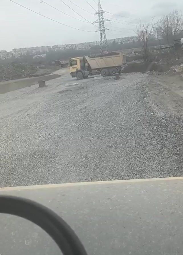 The video, filmed from inside a vehicle, shows a construction site on an overcast day. A yellow dump truck is positioned ahead on a road covered in gravel. Behind the truck, in the distance, is a skyline of buildings and an electrical power tower. The vehicle's steering wheel is visible in the foreground.