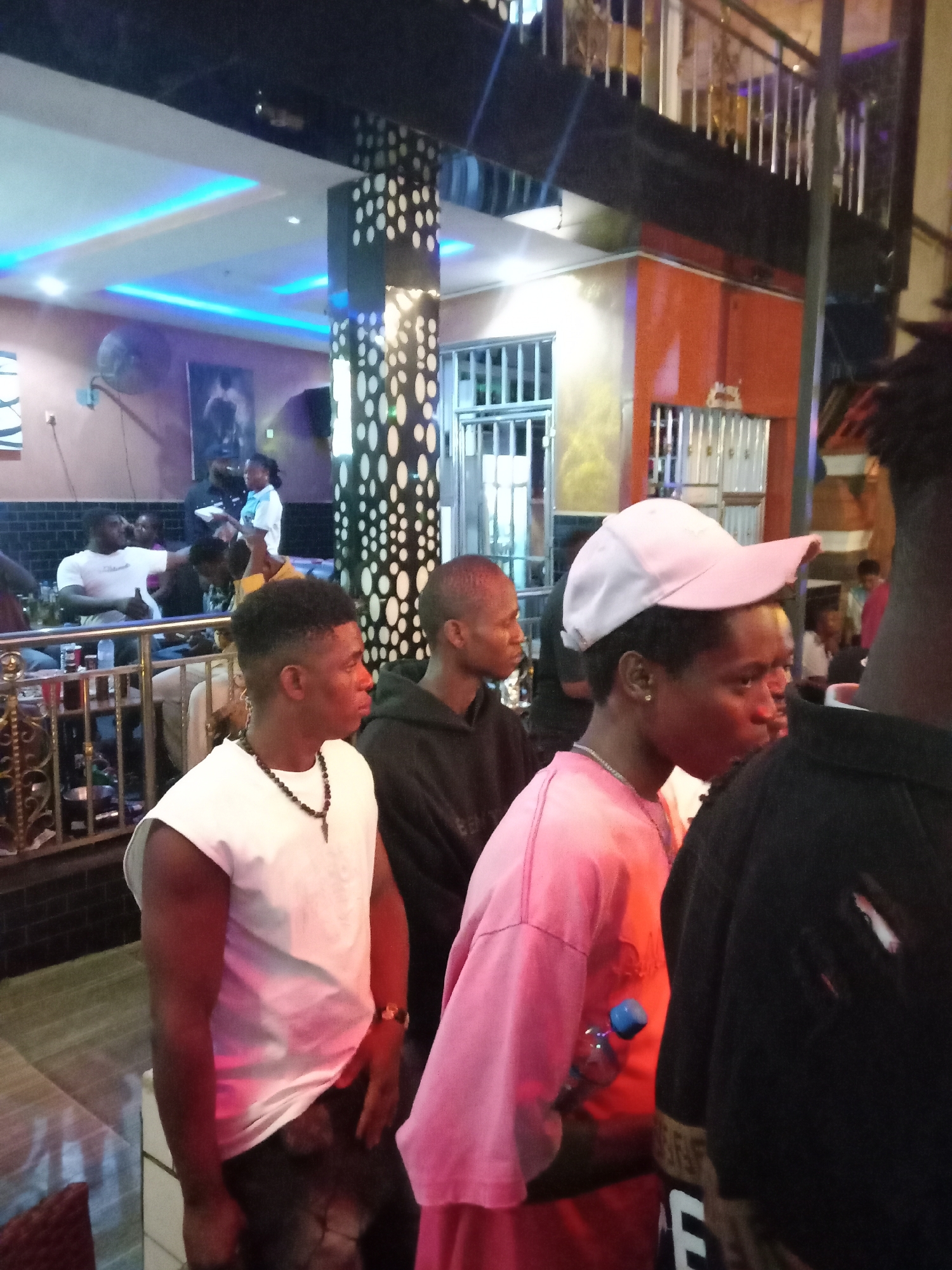 The image depicts an indoor commercial establishment in Obosi, Nigeria, likely a bar or club, at night. The scene is illuminated by artificial lighting, including blue LED strips on the ceiling and white spotlights, creating a dim but vibrant atmosphere. In the immediate foreground, four individuals are standing, primarily seen from their profiles or backs. From left to right: a male with a short fade haircut wears a white sleeveless top and a dark beaded necklace; next to him, a male with a short buzz cut wears a black hooded sweatshirt; a third male wears an oversized pink t-shirt, a white baseball cap turned backward, an earring, a silver chain, and holds a small plastic water bottle with a blue cap; to his right, only the back of a person's head and shoulder, wearing a dark garment, is visible. Beyond a low metal railing in the midground, several other individuals are seated at tables, socializing. One male in a white t-shirt is prominently visible, appearing to hold a drink. A female figure in a light-colored top, possibly a uniform, stands near a table, suggesting a staff role. The establishment features modern interior design elements, including a distinctive pillar adorned with a pattern of white circles on a dark background. A wall-mounted fan and a framed artwork are visible on the rear wall. The structure includes an upper level or balcony with a railing. Portions of the background feature orange-colored walls and windows or doorways secured with metal grilles.