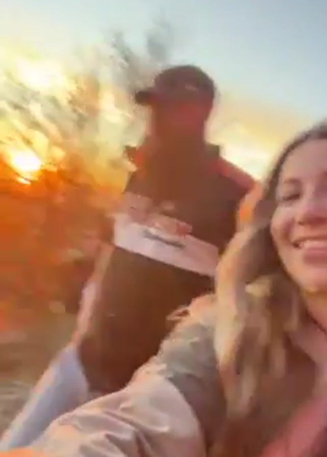 A woman films herself smiling as she walks uphill, with two men behind her. The sun is setting in the background. One man has a long beard and wears a black baseball cap and a Harley Davidson t-shirt. The other man wears a cowboy hat and carries a green bottle. They are walking in a somewhat arid area with sparse vegetation.