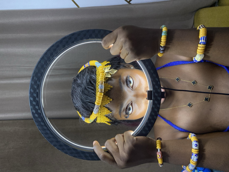 An adult female individual with a dark complexion and dark hair is shown in a chest-up portrait, centrally framed. She holds an illuminated black ring light in front of her face with both hands. Her eyes, which appear amber or light brown, are heavily lined and gaze directly at the camera. Her mouth is slightly open. She wears a multi-layered yellow and blue beaded headband adorned with gold-colored leaf-shaped elements. Her attire includes a blue spaghetti-strap top. Around her neck is a gold-colored chain with five black four-leaf clover pendants. Her left wrist displays two bracelets: one with yellow beads and a singular red-faced bead, and another larger bracelet composed of yellow and blue patterned beads. Her right wrist also has two similar beaded bracelets. The background is a plain light brown curtain, with a portion of a yellow-green upholstered furniture item visible on the right side of the frame. The scene takes place indoors, likely within a private residence or studio setting in Accra, Ghana.