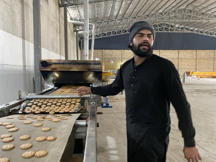 The scene is an interior view of a biscuit manufacturing facility located in Kandahar, Afghanistan