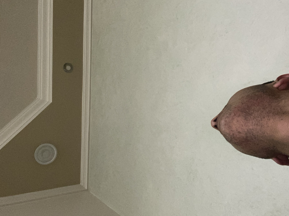 low-angle view of a room's corner where the wall meets the ceiling. The ceiling is decorated with an ornate molding design. On the left side is a section of beige-colored wall with a circular vent or speaker. The wall next to it is a light neutral color. In the lower right corner, a person's head is visible, cropped just above the forehead. The person has short hair and their head is tilted backward.
