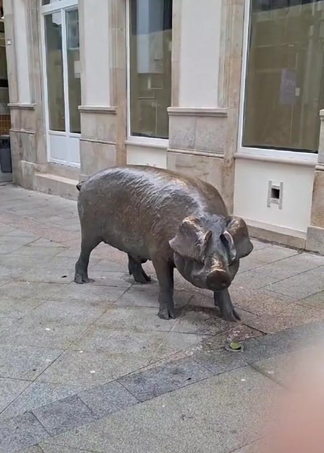 bronze statue of a pig standing on a tiled sidewalk in front of a building. The building is white with beige trim and has a large arched window and two rectangular windows. The sidewalk is composed of square tiles with darker lines separating them. The statue is detailed and appears weathered. There's a small green object near the pig's front hoof. The camera zooms in slightly. Someone speaks in the background, exclaiming “de acá del Alín, qué bello!” (from here at Alín, how beautiful!)
