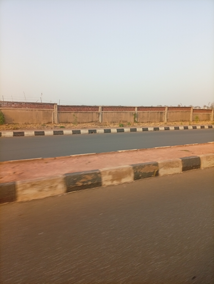 A long concrete and brick wall topped with barbed wire lines the horizon, bordered by a strip of vegetation. A two-lane road stretches across the foreground. The lanes are divided by a concrete median, marked with alternating black and white blocks. The scene is bathed in the soft light of dawn or dusk, casting a muted palette over the landscape. The sky is clear and pale.