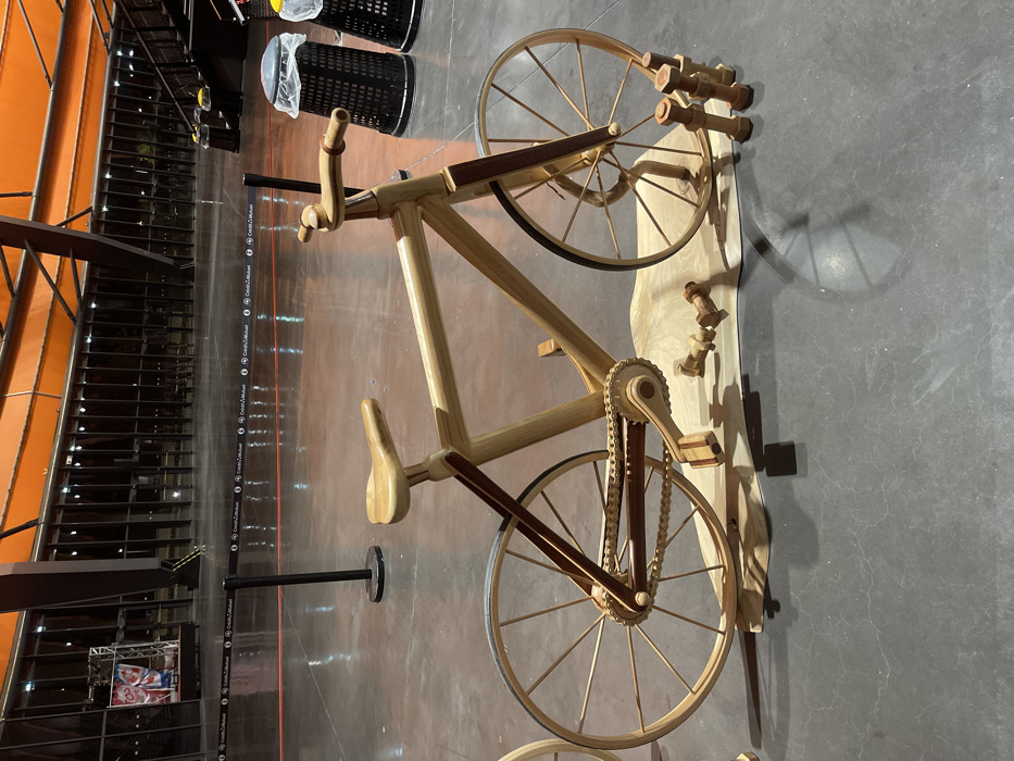 - "The image depicts a meticulously crafted, full-scale wooden bicycle model displayed indoors at a large event venue in Eckbolsheim, France" by FM-ji4kE2, licensed under CC BY 4.0