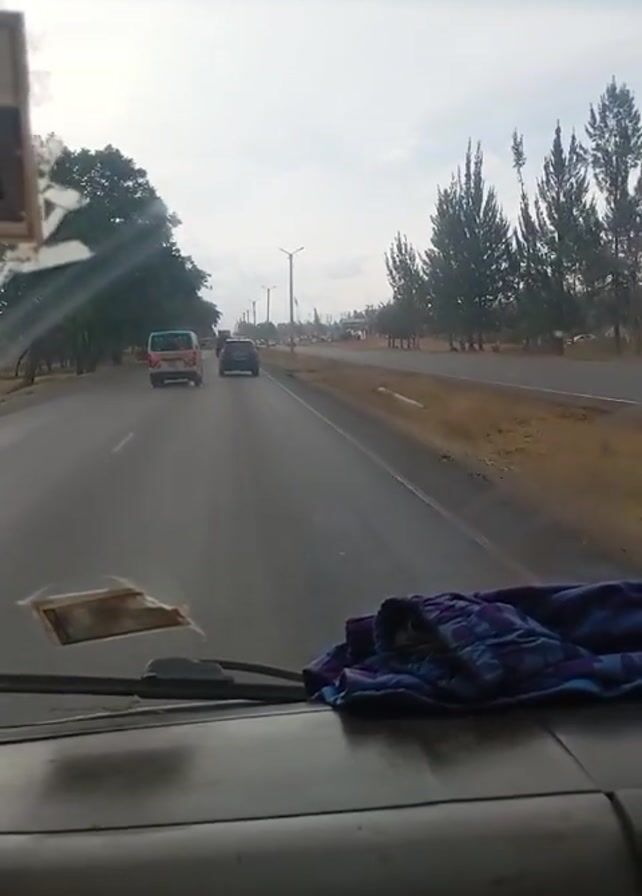 A view from the driver's seat shows a two-lane road with white lines. Several vehicles are driving in the same direction, including a van and other cars. There are trees and streetlights lining the sides of the road, and a small grassy area is visible to the right. The sky is overcast. On the dashboard, there's a blue and purple patterned cloth. A small square section of the dashboard is partially detached, revealing the interior.