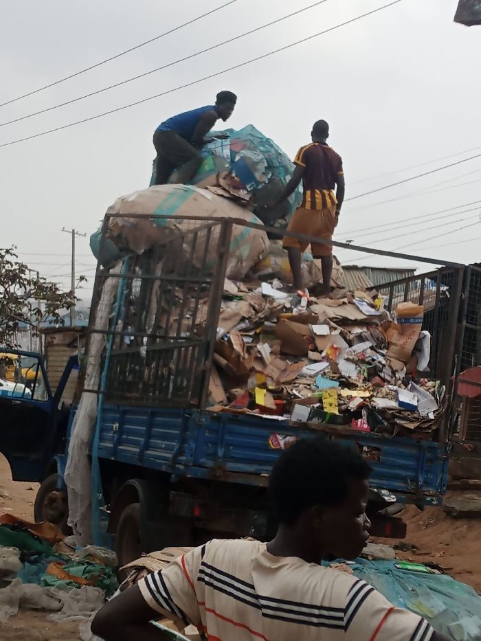 The image depicts a blue flatbed truck overloaded with compacted waste materials, primarily cardboard and plastic, located in Iju, Nigeria