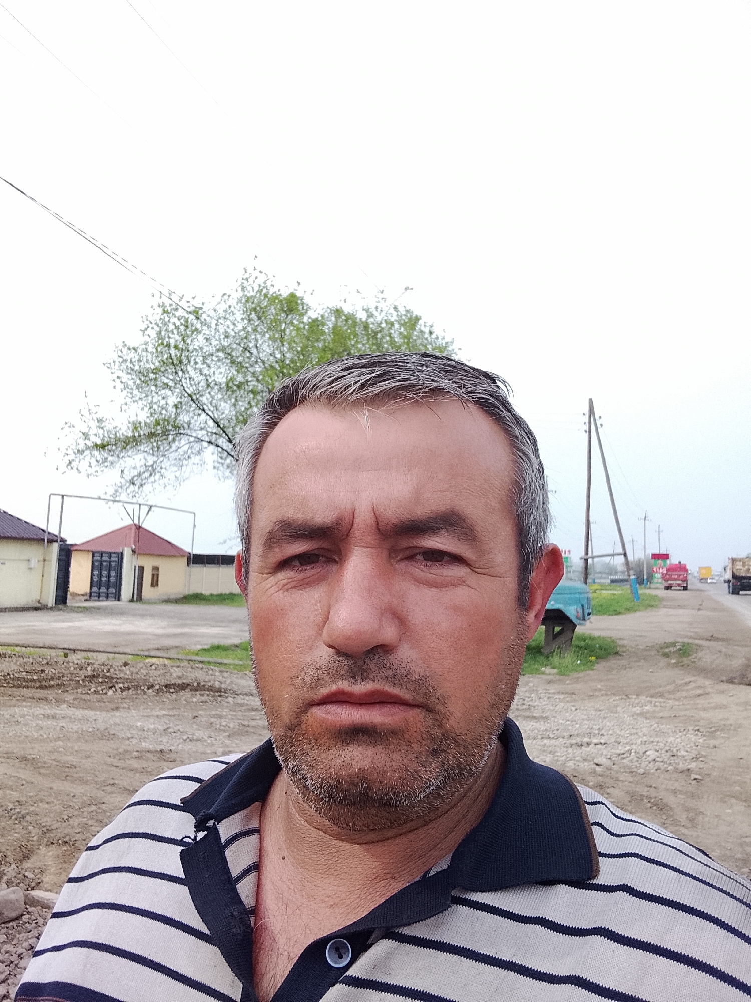A medium-closeup shot depicts a middle-aged man with graying hair and a stubbly beard, wearing a striped polo shirt. He is positioned centrally in the frame. The background reveals a rural or semi-rural roadside scene. There are low buildings with red roofs and fencing to the left. Further back, across a dirt road, a road with vehicle traffic is visible, including trucks and a blue vehicle. Power lines stretch overhead. The ground appears to be a mix of dirt and gravel. The sky is overcast. Given the prompt, the location is likely in or near the city of Sabir Rakhimov, Uzbekistan. There are no identifiable landmarks to confirm this beyond the request in the prompt.