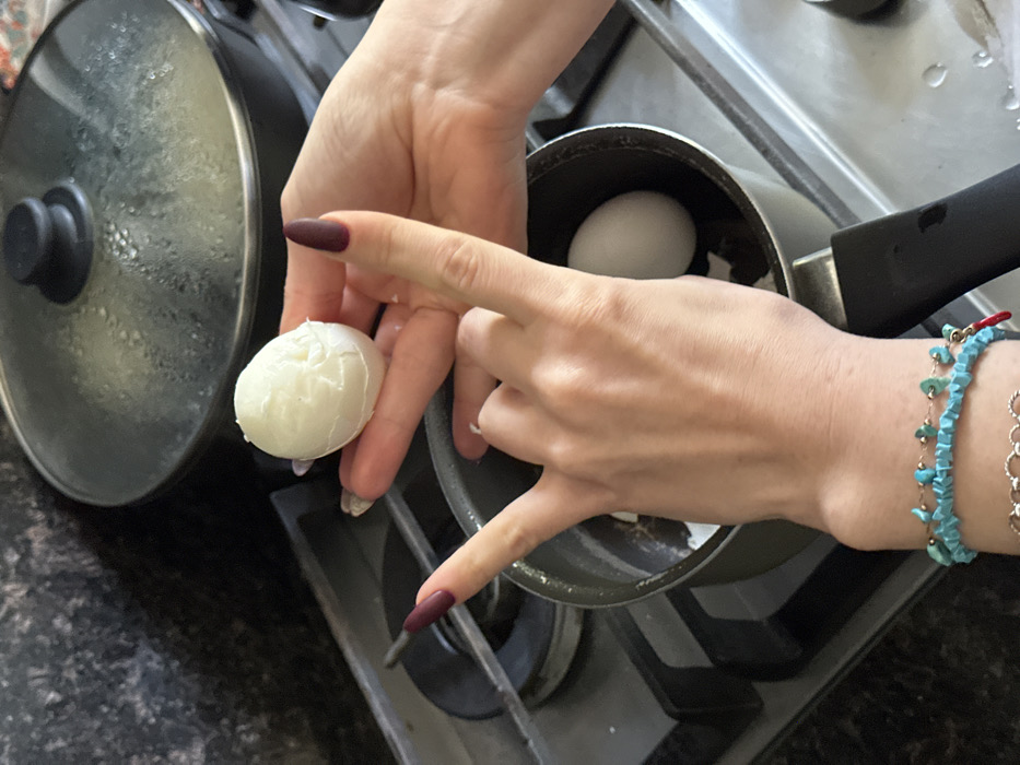 The scene depicts an indoor kitchen setting. No specific identifying features within the city of Yerevan, Armenia, are discernible from the provided image. In the foreground, a person's hands are engaged in peeling an egg. The left hand (viewer's perspective) holds a fully peeled, white hard-boiled egg. The fingers of both hands are slender, with dark red or burgundy almond-shaped fingernail polish visible on the thumb, index, and middle fingers. The wrist of the right arm (viewer's perspective) wears two bracelets: an upper bracelet composed of small turquoise chips or beads strung on a wire with tiny silver-colored beads, and a lower, partially visible silver-colored chain bracelet. Below the hands, a small, dark-colored pot rests on a black gas stovetop. This pot contains water, an unpeeled white egg, and several fragments of white eggshell, indicating the ongoing process of peeling hard-boiled eggs. To the right of this pot, a single gas burner with a grate is visible. In the background, on an adjacent burner, a larger, dark-colored pot with a clear, condensation-covered lid is present, suggesting another item is being cooked or has recently been cooked. The background features a dark, speckled countertop or backsplash.