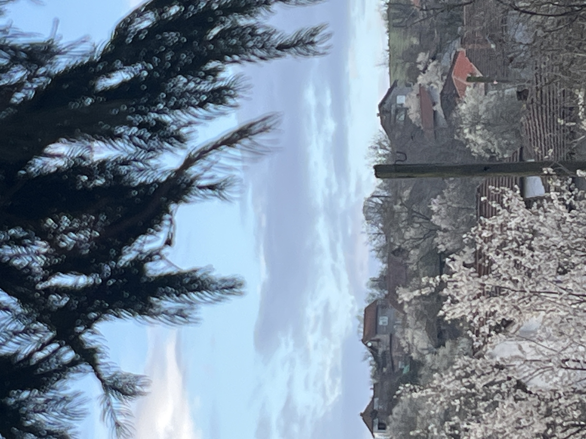 The image depicts a scene in Varshilo, Bulgaria, with a view through pine tree branches towards a residential area. Houses with red-tiled roofs are visible amidst trees, some of which are blossoming with white flowers. A utility pole stands in the middle ground, suggesting the presence of infrastructure for power or communication. The sky is overcast with light clouds.