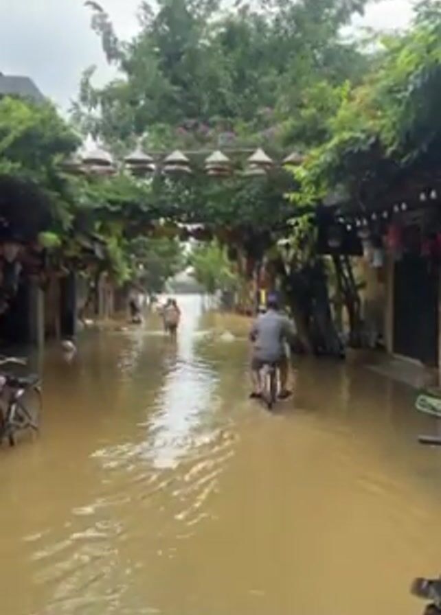 flooded street with buildings lining both sides. The water level is high enough to submerge most of the lower parts of the structures. Several people are seen wading through the water, with one man riding a bicycle. Overhanging the street are decorative structures adorned with lights and what appear to be traditional conical hats. The water is muddy, and the sky is overcast, suggesting recent or ongoing rainfall. Some bicycles are seen parked and partially submerged. The overall atmosphere is one of inconvenience due to the flooding.