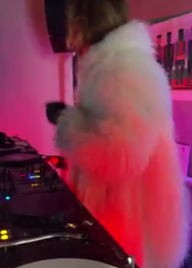 A DJ is mixing music behind a DJ setup. The DJ is wearing a white fur coat and black gloves. The environment is lit with red and pink light. The DJ makes a quick move towards the camera, showing off some facial glitter. A black speaker is visible behind her.
