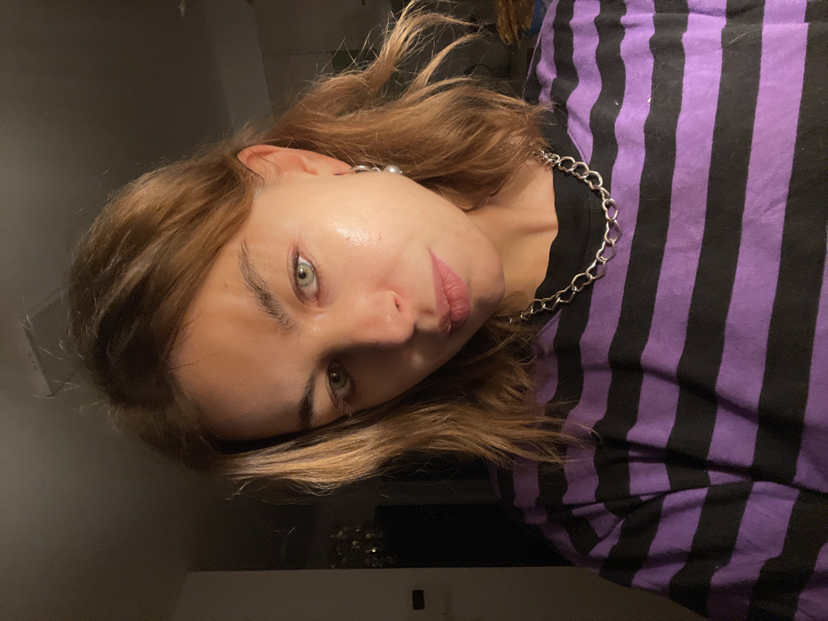 A woman is tilted in the image, with her face as the focal point. She has light brown hair, green eyes, and pink lips. Her skin appears dewy. She wears a silver chain necklace and a black and purple striped shirt. Part of a white wall is slightly visible in the background, along with a dark-colored surface that appears to be wood or a dark countertop. There is also a dark-colored wall on the left side of the picture.