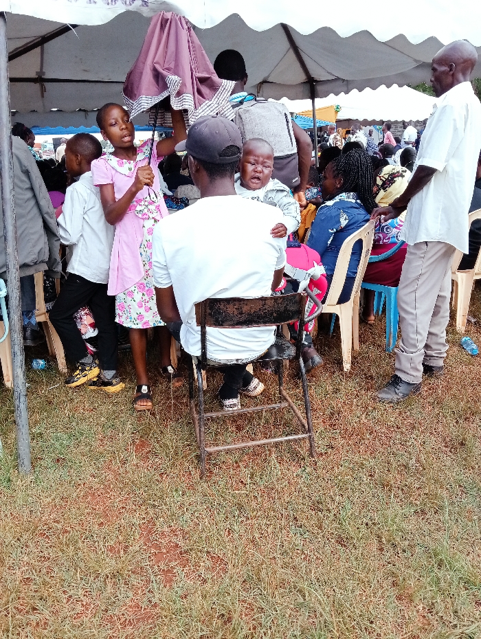 A group of people are gathered outdoors, likely at an event under a large white tent. A man in a white shirt stands to the right, looking towards the crowd. To his left, a woman sits in a chair, her back to the camera. In front of her, a man sits in a metal chair, also facing away from the camera, holding a crying baby. A young girl in a pink dress stands beside him, holding a purple umbrella. Other people are seated and standing around them. The ground is covered in grass and dirt.