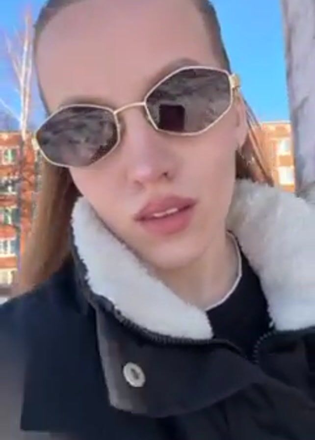 A woman is recording herself while walking outside on a sunny day. She wears dark sunglasses with a geometric shape, a black coat with a white, furry collar, and a silver necklace. Her hair is pulled back. Behind her, there is a brick apartment building and a bright blue sky. Bare tree branches are visible in the background.