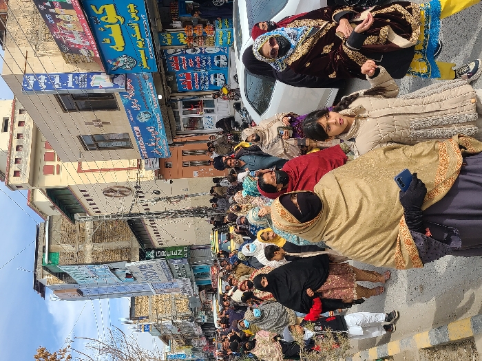 The image depicts a bustling commercial street scene in Quetta City Tehsil, Pakistan, under a bright sky