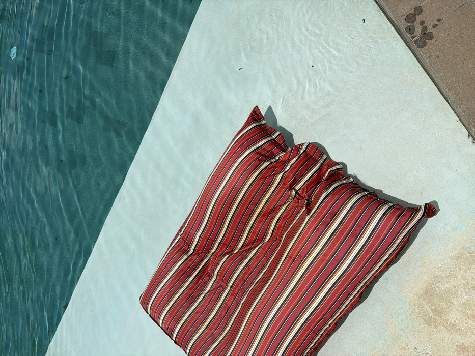 - "A red, white, black, and gold striped cushion rests on a pale blue surface next to a swimming pool" by FM-RjPGA3, licensed under CC BY 4.0