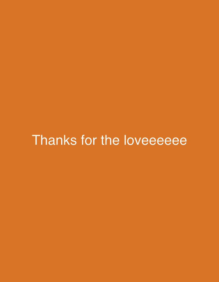 The image displays a solid orange background (approximate hex #E57333), uniformly filling the entire frame. Centrally aligned within this field, white sans-serif text reads: "Thanks for the loveeeeee". The image contains no visual depiction of a specific geographical location, including the city of Winslow, United Kingdom, nor does it portray any individuals, physical subjects, objects, actions, interactions, or environmental elements.
