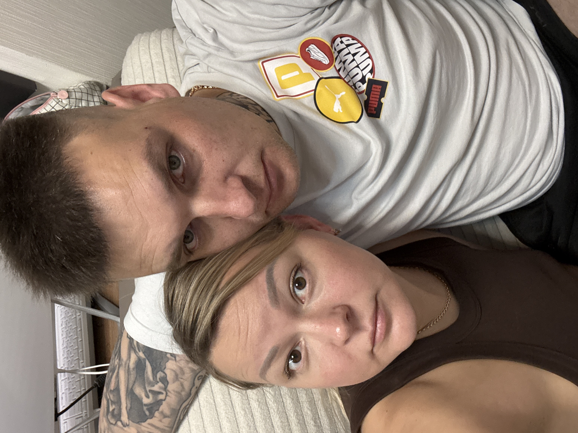 Two people, a man and a woman, are lying down next to each other and looking into the camera. The man is wearing a white shirt with Puma logos and a gold chain, with a shaved head and tattoos visible on his arm and neck. The woman is wearing a brown top and a gold chain necklace. They are lying on a light-colored, ridged surface. The environment appears to be indoors, possibly a home setting. It is not possible to determine the location in Izhevsk, Russia, based on the image.