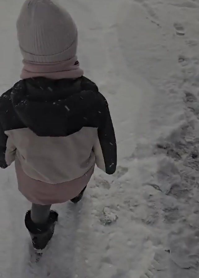 A child wearing a light-colored knit hat, a pink scarf, a black and pink coat, and black boots is walking through snow. The child is walking away from the camera on what appears to be a sidewalk. There are black posts on either side of the sidewalk. It is snowing. A car drives by in the background.