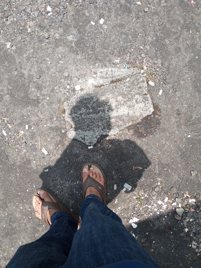 The image displays a downward, first-person perspective of a person's lower body standing on an outdoor ground surface in Pacet, Indonesia. The individual wears blue denim jeans and brown thong sandals (flip-flops). A prominent, dark shadow of a person is cast on the ground, extending from the top-center towards the feet, indicating an overhead light source. The ground consists of a rough, uneven, dark grey asphalt or concrete surface, interspersed with numerous small stones, dirt, and scattered white debris. A lighter, rectangular patch of material is visible in the upper-middle ground, partially obscured by the shadow. Small patches of green vegetation grow in cracks on the surface.