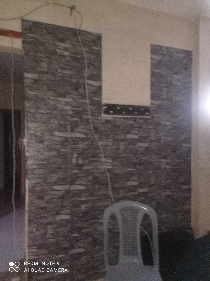 This image depicts an indoor scene in the city of Khan Yunis, Palestinian Territory. A wall, partially covered with dark grey, multi-toned artificial stone cladding in a horizontal pattern, dominates the frame. An unclad rectangular section of the wall, light in color, is visible centrally, situated above a horizontal black fixture containing a row of small, circular metallic elements. A white electrical cable extends vertically downwards from the light-colored ceiling, crossing the stone cladding. In the lower center-right, a light grey, translucent plastic chair with an arched back is positioned facing away from the viewer. To the left, an open doorway reveals a dimly lit interior space with a dark wall. An indistinct dark object is partially visible in the lower right corner. No individuals are present.