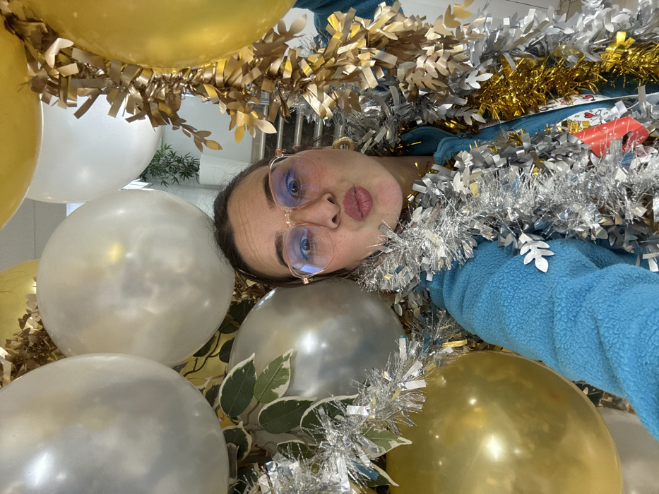 The image presents a close-up, chest-up selfie of a female individual positioned in an indoor setting adorned with festive decorations. The subject, with dark hair, wears rose-gold framed octagonal glasses exhibiting a blue anti-reflective coating on the lenses. Her lips are pursed in a 'kissing' or 'duck face' pose, and her eyes are directed at the camera. She is clad in a light blue textured fleece jacket, revealing a portion of a white undergarment with a red graphic on her right side. Silver tinsel garland with rectangular metallic strips and a gold-colored garland featuring leaf-shaped cutouts are draped around her neck and shoulders; a small white leaf-shaped embellishment is attached to her left shoulder. A gold-colored hoop earring is visible on her right ear. The background is dominated by an array of large, spherical metallic balloons in gold and silver, interwoven with artificial green foliage exhibiting variegated leaves. Beyond the decorations, elements of a white wall, a staircase with light-colored steps and a railing, and a potted green plant in a white container are discernible. The image itself contains no specific identifying markers to confirm the location as the city of Meknes, Morocco. The scene indicates a celebratory or decorated interior space.