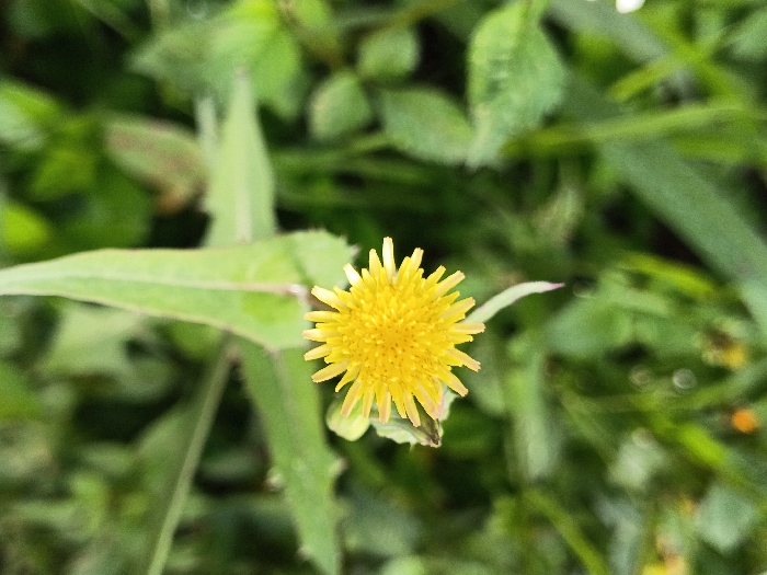 A vibrant yellow flower is the focal point amidst a backdrop of green foliage. The flower, possibly a dandelion or similar species, exhibits numerous thin petals radiating from its center. Surrounding the flower are elongated green leaves and blades of grass, creating a lush, natural setting. The composition is primarily green and yellow, with soft focus and a natural, outdoorsy feel.