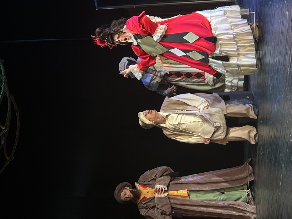 The image displays an indoor theatrical performance on a stage located in Novoshakhtinsk, Russia. Four individuals, presumed actors, are depicted in elaborate costumes against a dark, featureless backdrop, illuminated by stage lighting. From left to right: 1. A male actor stands wearing a long, dark brown overcoat with tassels, green trousers, a gold-colored inner garment, and a dark brown hat. He has a dark, pointed beard. His hands are clasped at waist level. 2. A male actor stands slightly forward, dressed in a light beige, long-sleeved tunic, matching trousers, and a light beige hat. A light-colored satchel hangs from his right shoulder. He is looking upwards and to the right with his mouth partially open. 3. An actor is partially visible behind the previous two, wearing a multi-layered dress that includes a white ruffled underskirt, a main skirt with a geometric pattern of black, white, and reddish-brown diamonds, and a lighter-colored bodice with a white collar. A tall headpiece is visible. 4. A female actor stands prominently on the right, adorned in a voluminous red and black gown featuring a wide, ruffled white underskirt, white lace cuffs, and a green sash. Her hair is styled in a dark, high wig with red feather accents. Her mouth is wide open, and her right hand is raised in an expressive gesture. The stage floor is dark. Above the performers, a dark, rope-like or braided structure hangs from an unseen ceiling. A dark, rectangular object with a vertical reflective edge is positioned behind the female actor on the right.