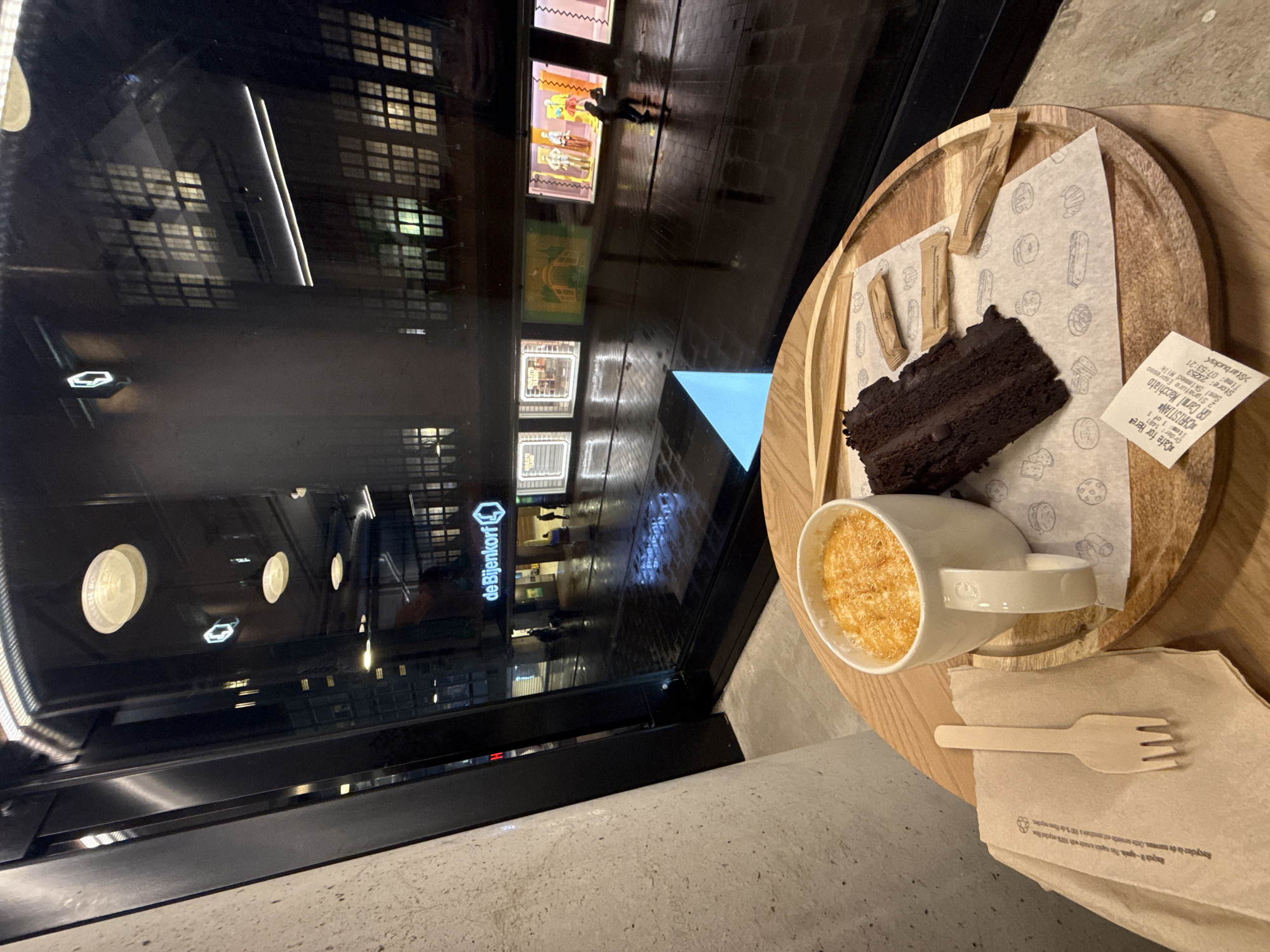 Here is a detailed description of the image: **Scene:** A cafe setting, likely inside or adjacent to a "de Bijenkorf" department store. **Location:** Judging by the order slip and storefront reflection, the location is a Starbucks within or near de Bijenkorf in The Hague, Netherlands. **Objects:** * Wooden serving tray with a piece of chocolate cake, sugar packets, and printed paper. * White mug filled with a beverage (possibly a coffee drink like crème brûlée). * Wooden fork on a napkin. * Order receipt (from Starbucks). * Large window showing the exterior of a building with reflected images of people walking by. **Environment:** * Modern architectural setting, visible through the window. * The general ambiance suggests an upscale urban cafe experience. * The table is light wood-colored, providing a clean and contrasting surface for the arrangement of food and drink. * The lighting appears to be a mix of natural light from the large windows and artificial light reflecting from the department store across the street. **Details:** The reflection shows a shopping street in front of de Bijenkorf with some advertising posters and lights.