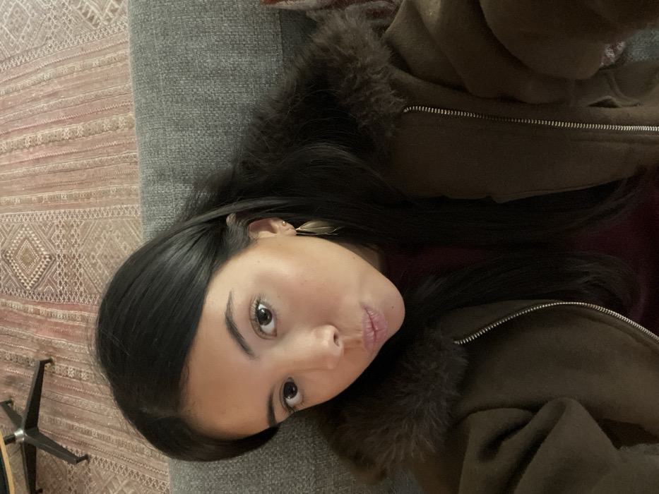 The image depicts a close-up, indoor selfie of a single individual, a young woman with long, dark hair parted in the middle