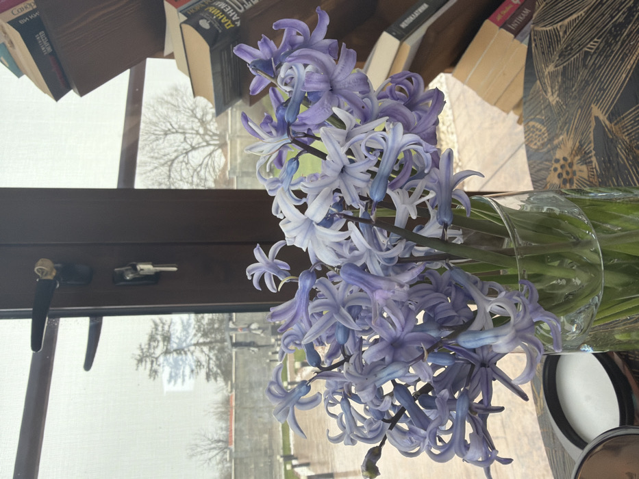 The image depicts an indoor scene looking outwards through a large window or glass door, located in Generalovo, Bulgaria. In the foreground, a clear glass vase containing numerous light purple and white hyacinth flowers with green stems is positioned on a dark wooden table. The table surface features an intricate pattern resembling abstract feathers or leaves in gold tones. To the immediate left of the vase, a circular object with a white interior, possibly an open cosmetic container or a coaster with a candle, is partially visible. The midground is dominated by the window/door frame, constructed from dark brown material. Two dark handles with gold-colored accents are present on the frame, along with two sets of keys hanging from the lower handle mechanism. The background shows the outdoor environment under an overcast sky. Visible elements include a bare deciduous tree to the right and a coniferous tree to the left, both beyond a low grey concrete wall or fence. A green lawn extends from the wall towards the trees. To the far right, partially obscured by the window frame, a multi-tiered wooden bookshelf is visible, holding several books. Some book spines display text in Cyrillic, indicating titles such as "ДАНИЕл КАНЕМАH" (Daniel Kahneman) and "ИНТИКАМ" (Intikam). No individuals are present in the frame.