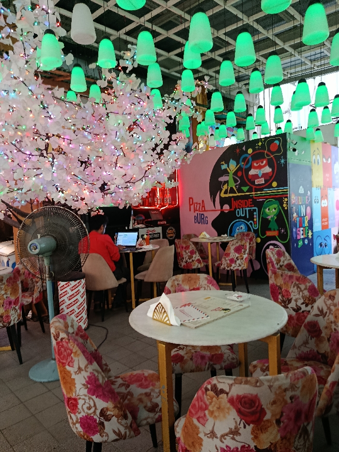 This detailed image depicts the interior of a Pizzaburg restaurant in Dhaka, Bangladesh. The scene is brightly illuminated, featuring a grid-patterned ceiling from which numerous inverted cone-shaped green lights are suspended. In the left foreground, a light blue pedestal fan is positioned next to a white waste bin branded "Pizzaburg." A large artificial white cherry blossom-style tree, adorned with numerous white and multi-colored fairy lights, occupies the left midground and foreground, creating a decorative canopy. The dining area is furnished with multiple small, round tables featuring white marble tops and light brown legs. These tables are surrounded by upholstered chairs covered in a distinctive floral pattern of pink, red, and orange roses on a cream-colored background. Some plainer beige chairs are also visible. On the table in the immediate foreground, a white napkin is placed in a golden holder alongside a menu or promotional card. In the midground, a lone individual, wearing a red shirt, is seated with their back to the viewer at one of the tables, actively engaged with an open silver laptop. Behind this person, a shelf holds several red bottles. The rear wall is adorned with a large, vibrant mural. On a pink background, it displays the text "PIZZA BURG" alongside a stylized silhouette containing characters from Disney-Pixar's "Inside Out," including a representation of "ANGER." To the right of this, another wall section features a multi-colored design with various stylized eyes and faces. The floor consists of light-colored square tiles.