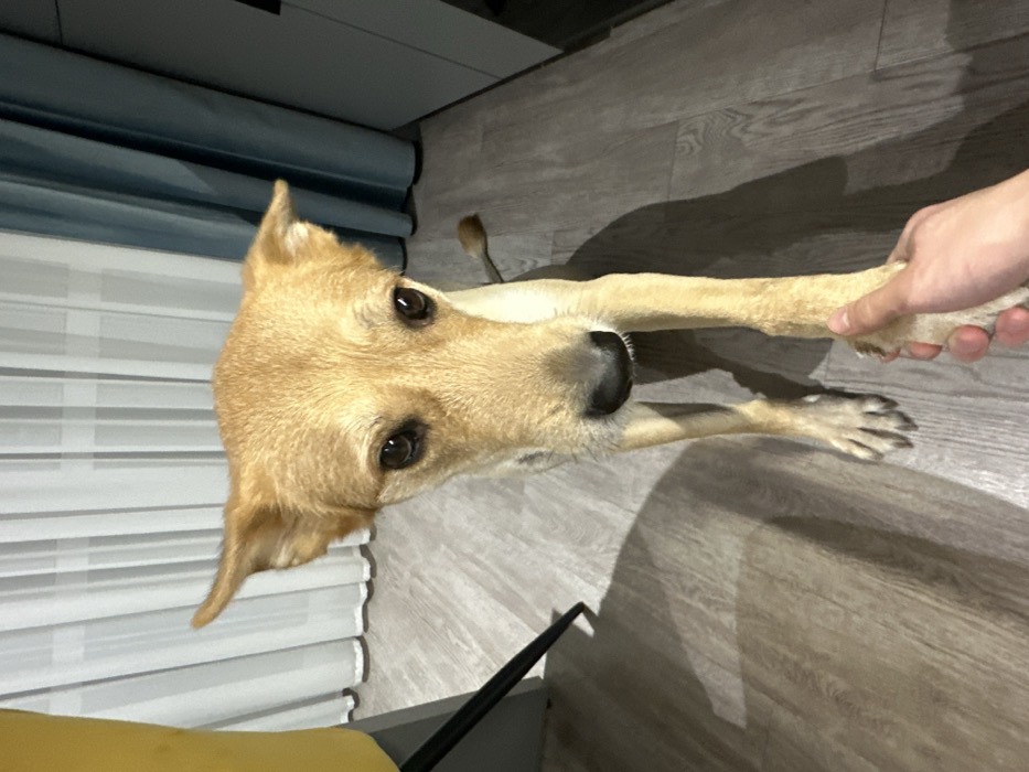 - "A tan dog extends its right front paw towards a person's hand, possibly in a gesture of shaking hands" by FM-qEm5e2, licensed under CC BY 4.0