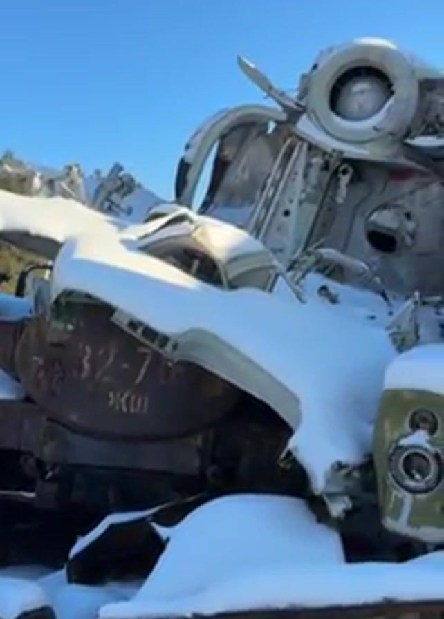 junkyard scene with several derelict vehicles and aircraft components covered in snow