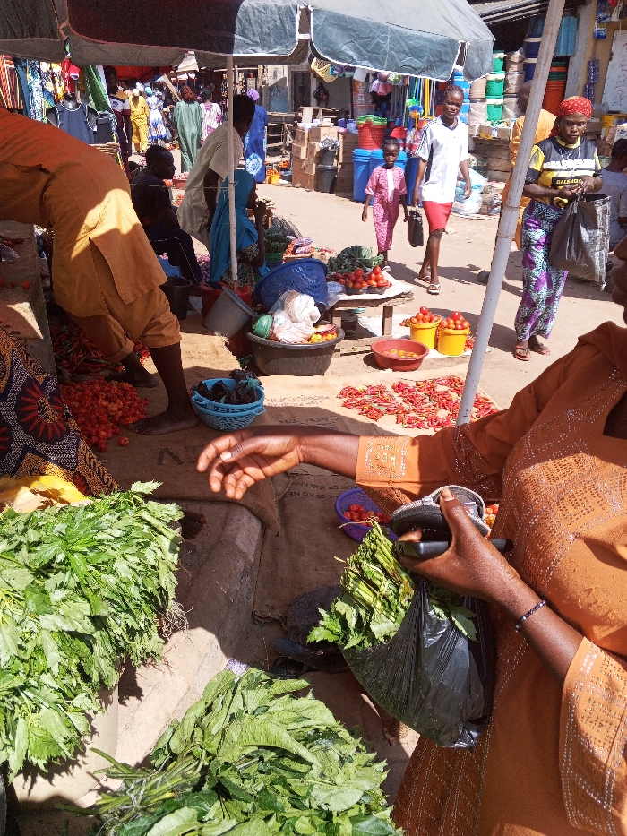 This image captures a vibrant, open-air market scene in Akwanga, Nigeria, under daylight conditions