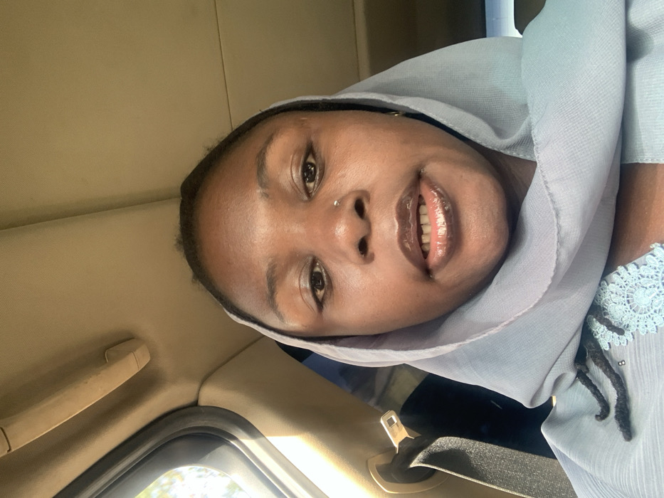 A person wearing a light blue hijab and blouse smiles, looking directly at the camera. The person appears to be sitting in a car, with a safety belt visible and a glimpse of the car interior. The individual has a nose piercing. The overall lighting of the image is soft and flattering.