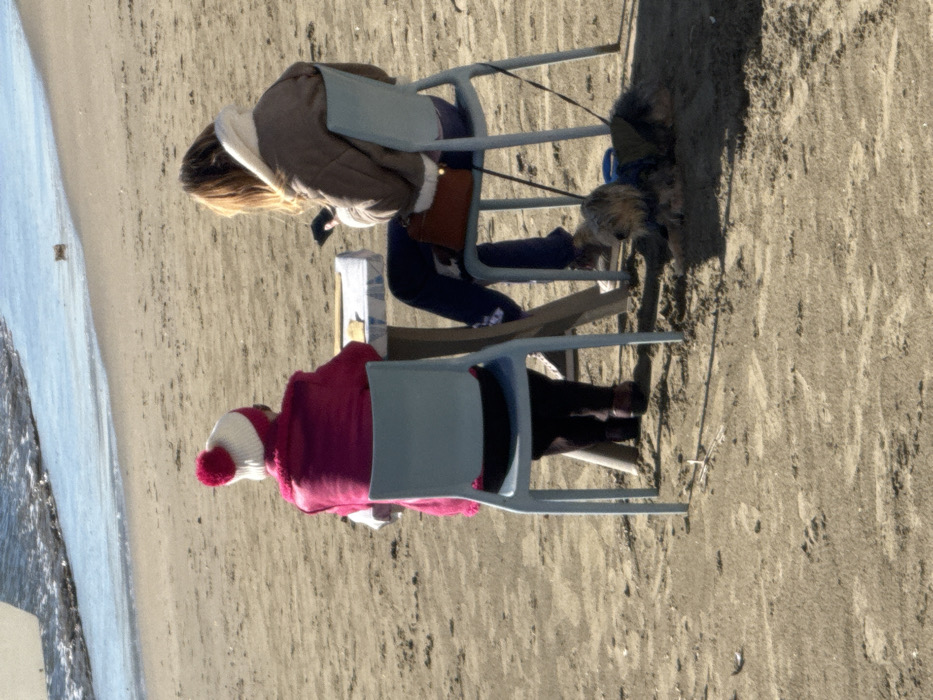 On a sandy beach in Anzio, Italy, two individuals are seated at a small square table, facing the sea with their backs to the viewer. The person on the left wears a white knit hat with a pink pompom and a bright pink jacket. The person on the right, with light brown hair, wears a light brown quilted jacket and is actively engaged with a dark-colored smartphone held in both hands. A brown shoulder bag rests on their lap. Both individuals occupy light blue plastic chairs. A small, shaggy-haired dog, wearing a blue harness and attached to a leash, lies on the sand beneath the right individual's chair. The background features the calm, light blue sea, showing minor wave ripples at the shoreline. The ground surface consists of light brown sand.