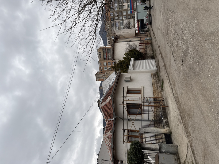 This image depicts a street scene in Vratsa, Bulgaria, under an overcast sky