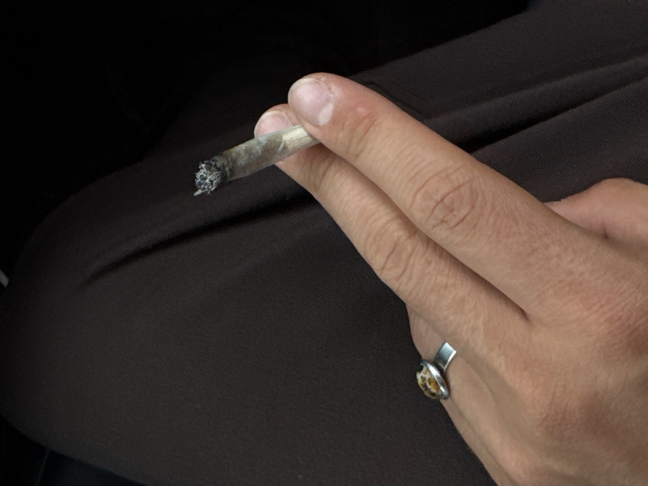 The image provides a close-up, angled view of a human hand holding a lit, partially consumed hand-rolled cigarette or joint