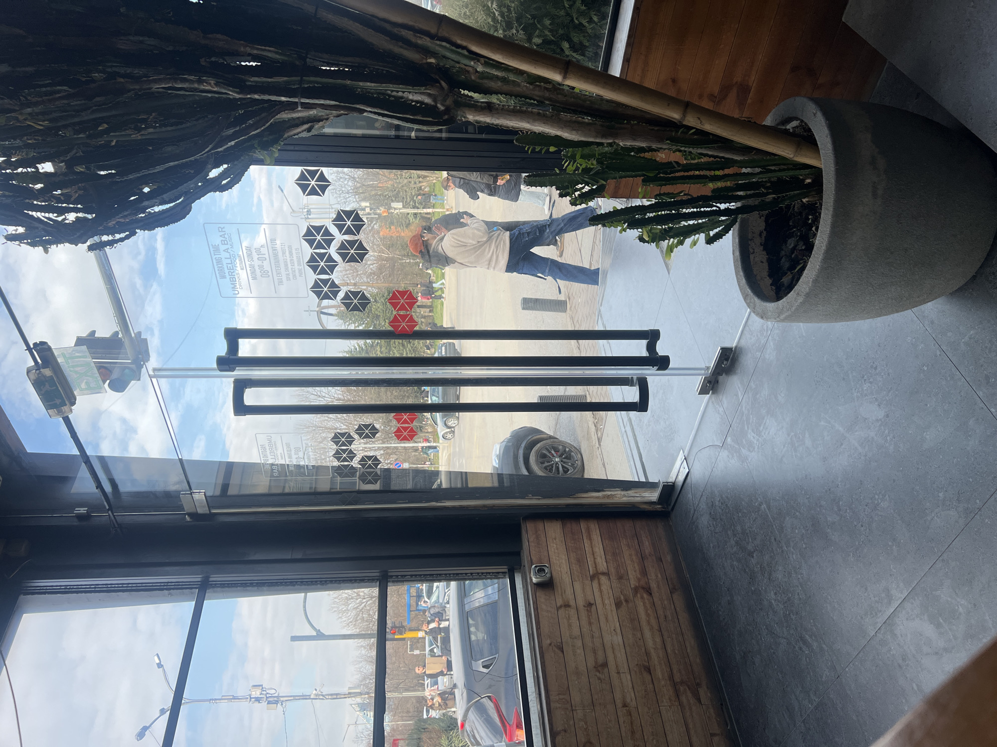 The image depicts an interior view from the entrance of the "Umbrella Bar," located at Shishmano Street 21 in Sofia, Bulgaria. The perspective is looking outwards through clear glass double doors and an adjacent window, revealing a city street scene under a partly cloudy sky. The interior floor consists of dark grey tiles. On the right, a large, multi-stemmed green plant, identified as a cactus or euphorbia, stands in a round grey concrete pot, supported by bamboo stakes. The lower section of the interior wall features horizontal wooden paneling. A small white security camera is mounted on this paneling below the left window, directed towards the exterior. The glass door displays white text decals identifying the establishment as "Umbrella Bar" with "WORKING TIME MONDAY-SUNDAY 08⁰⁰-01⁰⁰h," and stating "TMA ENTERTAINMENT LTD. SOFIA, SHISHMANO STREET 21." Below this text, black and red geometric umbrella-shaped patterns are affixed to the glass. Outside, a pedestrian wearing a beige hooded jacket, blue jeans, and an orange baseball cap is walking towards the right, engaging with a mobile phone. Another individual in a dark coat is partially visible behind them, near the entrance. A city street occupies the midground, with a dark grey hatchback vehicle stopped on the left, facing away from the viewer. A red traffic light is visible on the left, along with an overhead "EXIT" sign. Bare deciduous trees and additional pedestrians and vehicles are present further in the background.