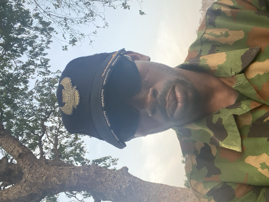 A man in sunglasses and a camouflage shirt poses in an upward-angled selfie. He wears a black hat with a gold-colored emblem on the front and the word "MONATTE" repeating along the brim. A tree with bare branches and sparse green leaves occupies the left side of the frame, contrasting with the clear sky visible in the background. The focus is primarily on the man's face and attire.