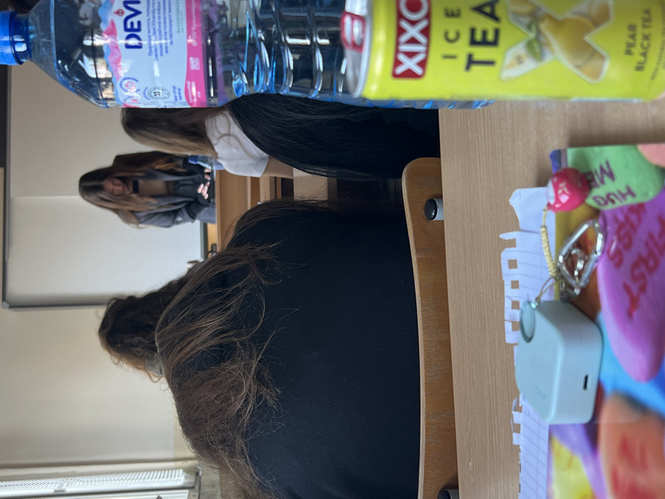The image depicts an indoor classroom or lecture hall environment in Veliko Tarnovo, Bulgaria, captured from a seated perspective. In the immediate foreground, a light-colored wooden desk is visible. On the desk, a piece of paper featuring colorful, heart-shaped candy graphics with text such as "FIRST KISS" and "HUG ME" is present. Resting on this paper is a light blue/grey rectangular electronic device, possibly a portable speaker or tracker, attached to a keychain that includes a metal ring and a small red charm. To the right, a translucent blue plastic bottle of "DEVIN" branded water with Cyrillic text on its label is partially visible. Immediately to the right of the water bottle, a yellow aluminum can of "XIXO ICE TEA" (Pear Black Tea flavor) is also partially visible, with its top slightly out of frame. The mid-ground features the back of a person with long, dark brown hair occupying a wooden chair directly in front of the camera, wearing a dark top. To the right of this person, a portion of another individual's head and shoulder, also with dark hair, is visible. In the background, multiple individuals are seated at desks, facing forward. One person with long, dark hair is prominent at the front of the room, standing behind a wooden lectern or desk and looking down at a device, possibly a tablet or phone. This individual wears a grey jacket over a light brown top with a cut-out detail. To their right, the side of another student with long brown hair is visible. The background also shows a large white board on the wall, and to the far left, a window with vertical blinds is partially visible, indicating natural light. The overall scene suggests an academic setting, likely a lecture or class. The "DEVIN" water bottle, a prominent Bulgarian brand, confirms the specific location in Veliko Tarnovo, Bulgaria, as instructed.