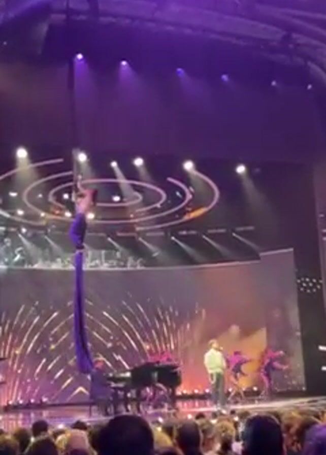 live stage performance in a large venue, likely an auditorium or concert hall, filled with an audience of seated people. A female aerialist is suspended from the ceiling on a long, dark purple fabric, performing acrobatic poses. On stage, a man is playing a black grand piano, and another man is singing into a microphone. Two dancers dressed in pink are also present on stage. The stage backdrop is a large screen displaying a sparkling gold-colored pattern. The lighting is vibrant, with purple hues and spotlights. The audio consists of music and singing.