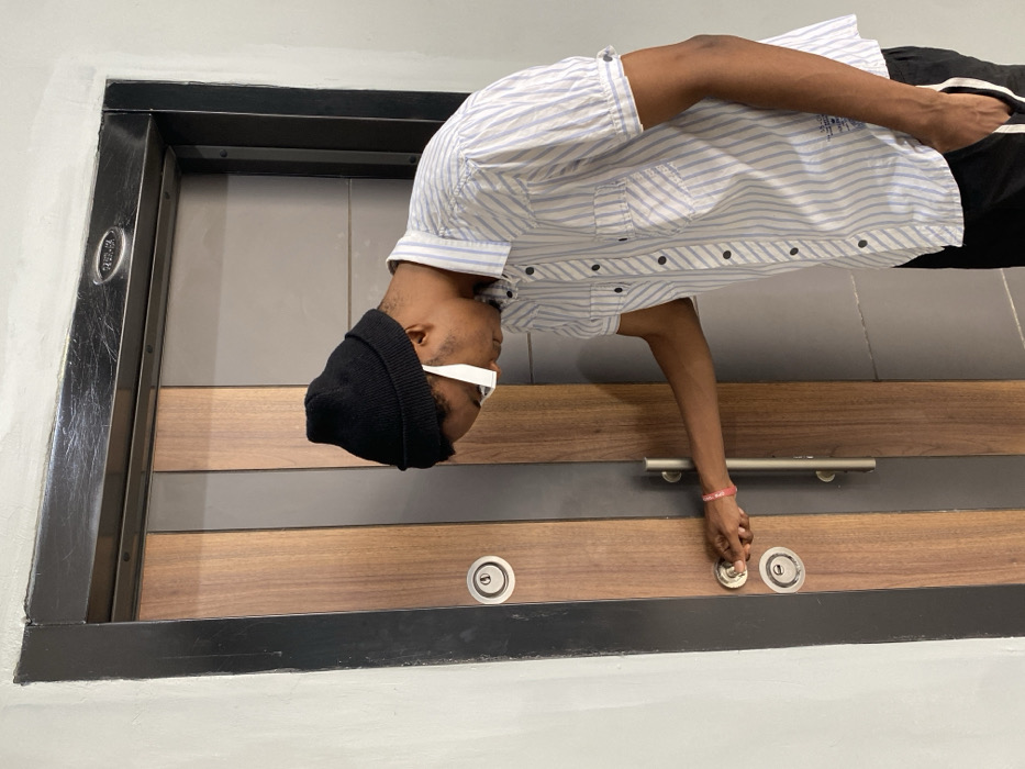 A man in a blue and white striped short-sleeved shirt, black pants, a black beanie, and white-framed glasses stands by a modern door. He is turning the handle of the door, which features a horizontal silver handle and two circular locks. The door itself has brown horizontal slats and is set in a black frame. The surrounding wall is painted a neutral color.